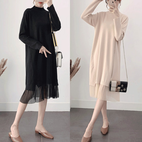2色 ハイネック 長袖 シースルー ミモレ丈 ニットワンピース
