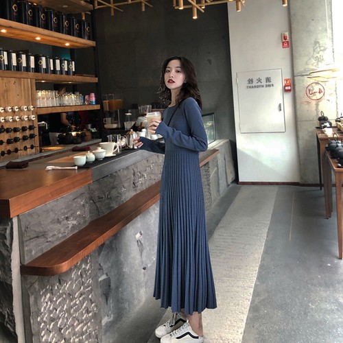 プリーツスカート スリム ロング丈 長袖 ワンピース