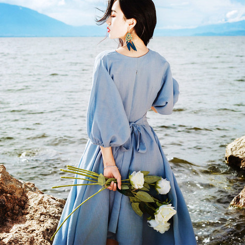 パフスリーブ Vネック フレア ワンピース