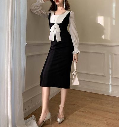バイカラーリボン付きボリューム袖ミモレ丈