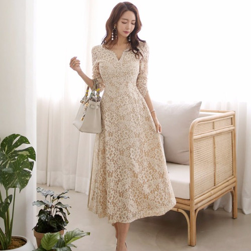 レース タイト ワンピース 上品 ミドル丈 フェミニン
