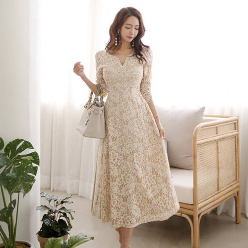 ベージュのワンピースに花柄のレース模様をふんだんに散りばめた 、優しい印象のワンピースです。