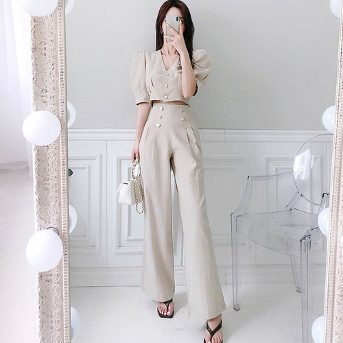 優しいベージュにパフスリーブ、 フワっと広がるフレアパンツが女っぽい、 フェミニンなセットアップです。 女性らしいアクセントを詰め合わせながらも、 ハイウエストのパンツにショート丈のジャケットを合わせて攻めた 印象に。ウエストをチラリとのぞかせて、 個性的なデザインに仕上げています。