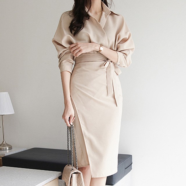 オフィスでも仕事着として着こなすのに十分な、 清楚なアイテムといえるでしょう。 スリムなシルエットで生真面目に見せながらも、 トップスはデザイン性のあるカシュクールとラップ風スカートに仕 上げています。抜け感のある着心地のため、 パッと見た印象ほどの窮屈さはありません。