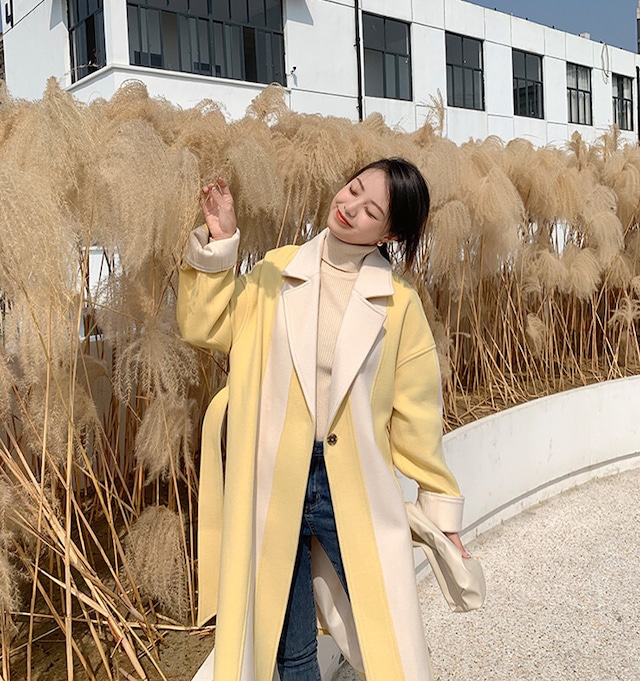 明るい黄色が、 あたたかな日差しのような心地よさを感じさせるロングコートです 。