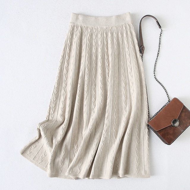 ニットといえばトップスのイメージが強いですが、こちらはめずらしいスカート。見た目はしっかりとしたニットらしさを感じさせますが、生地そのものはやや薄めのため、ロング丈でも重さを感じずに履きこなせるでしょう。