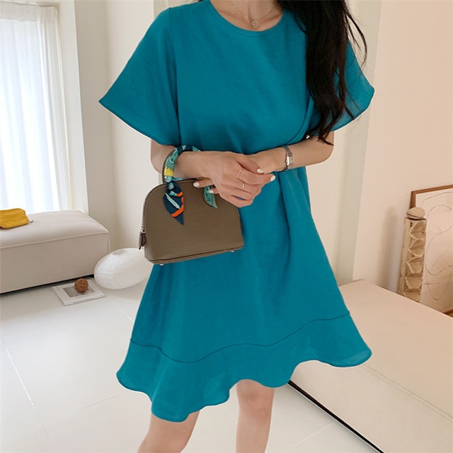 袖は大きく、スカート裾は大きなフリルを施したかのように見せ、 歩くたびにゆるやかに揺れるように。 ラフでありながらも涼しげなブルーが印象に残る、 夏を予感させるワンピースです。