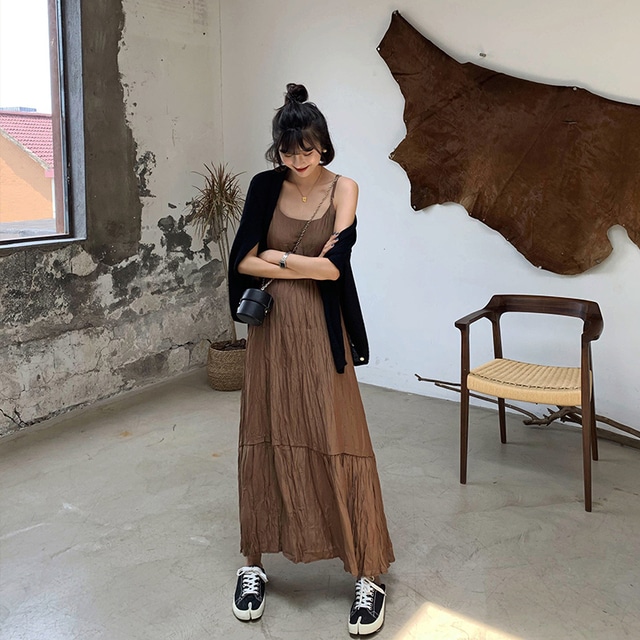 ブラウン一色のキャミワンピですが、 ギャザーとシワ加工でこなれた一着に。 大人っぽくもリッチな雰囲気へと仕上げてくれる、 便利なワンピースです。