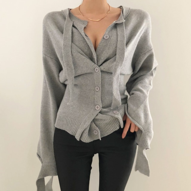切れっぱなしにした袖と襟元が特徴的なニットカーディガンです。ニットなのにヒラヒラとした生地がまとわりつくので、動く度アクティブな印象に。普通のニットカーディガンよりもルーズに着こなせるので、カジュアル派におすすめです。上のボタンをはずせば、デコルテが広く開くデザインになっています。真ん中のボタンを留めるとウエストがキュッと引き締まり、メリハリのあるスタイルが簡単に作れるでしょう。自分の体型にあわせてバランス良く作れるので、誰でも女性らしい身体のラインが際立ちます。マニッシュなセクシーコーデを試したい方は、ぜひ取り入れてみてくださいね。