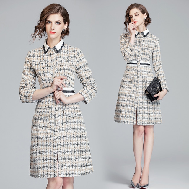 白を基調としながらも淡いチェックの織り柄が入ることで、よりリッチな雰囲気に。襟とベルトのようなアクセントでかしこまった雰囲気を作った、個性的なツイードワンピです。