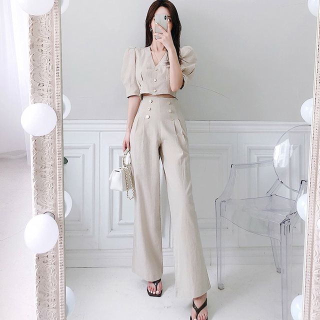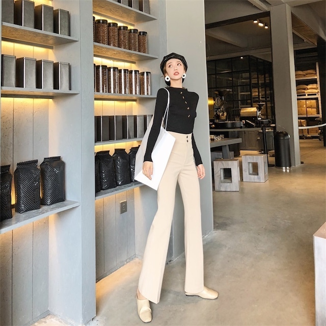 軽やかなカラーと生地にボタンを配置することで、リッチな印象に。裾に自然な広がりを見せるフレアパンツなので、フェミニンに着こなしたい方にもおすすめです。