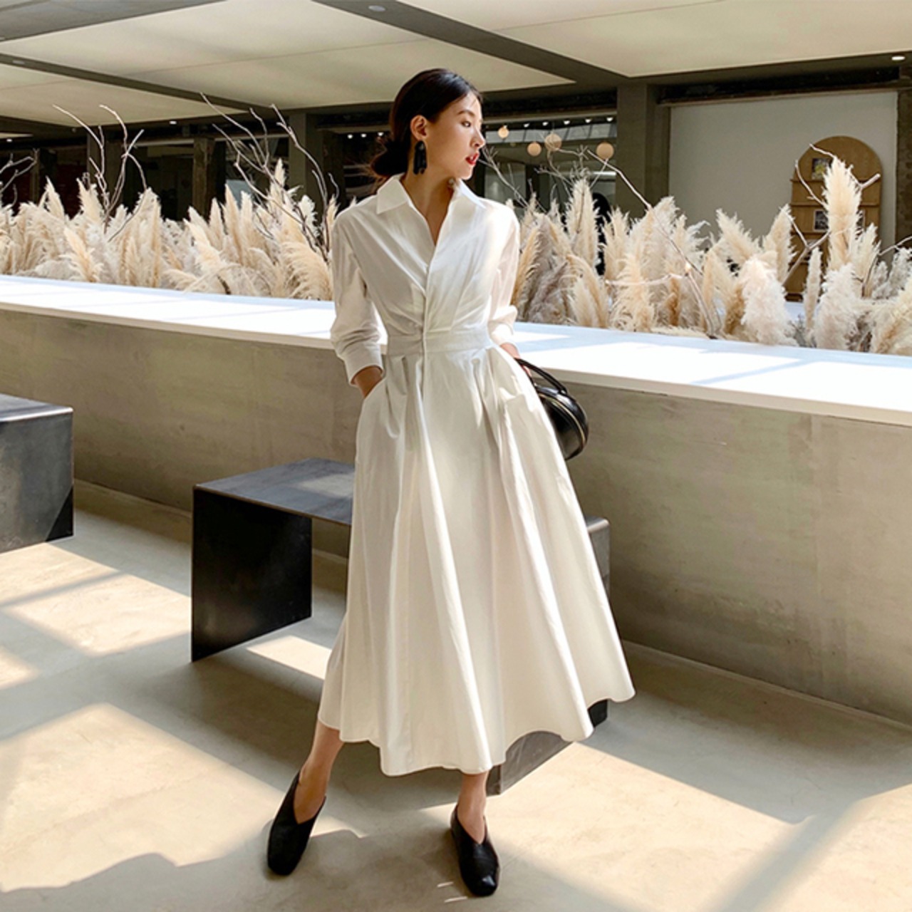 長袖タイプでも白のワンカラーならば、暑さを感じさせないもの。重めのロングスカートでも明るく存在感が際立ち、夏のシーンにもよく似合います。