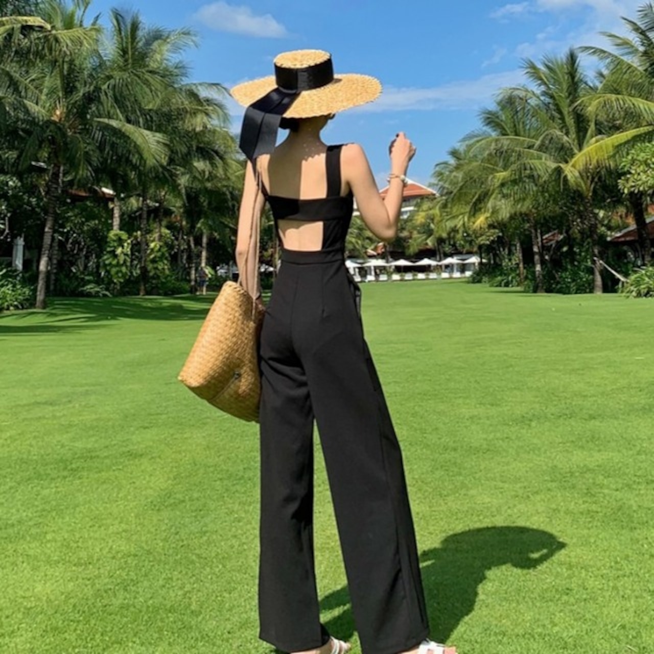 コンパクトな上半身にロングワイドなパンツを合わせた、クールなブラックオールインワン。ウエスト位置を高くしたことで、スタイル良く見せてくれる一着です。