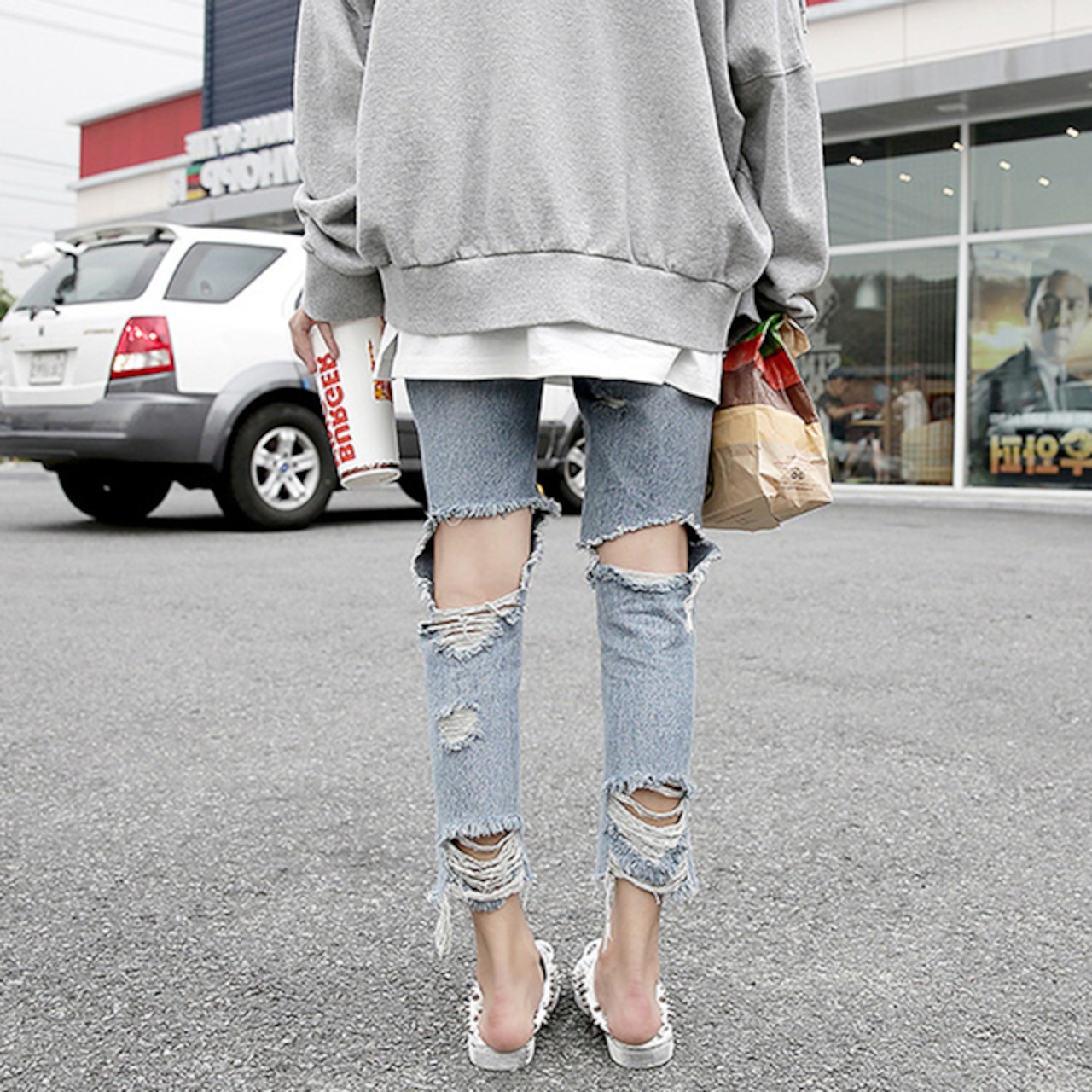 フェミニンな装いが苦手な人は、大きく穴を開けたクラッシュデニムを選んでみませんか?前よりも後ろのダメージが大きいので、後ろ姿で大胆に見せたい人にもおすすめです。