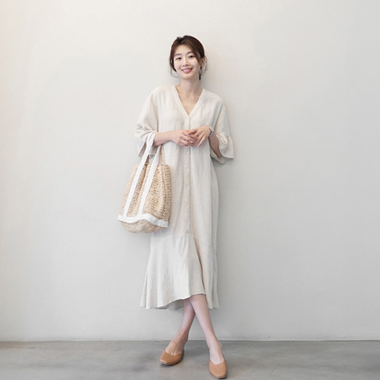 夏らしさもあるけれど、くすみがかったオフホワイトなので、夏の終わりにもちょうどいい雰囲気に。大きなフレア袖は夏の終わりにも良く似合ううえに、ラフに着やすいようデザインされています。