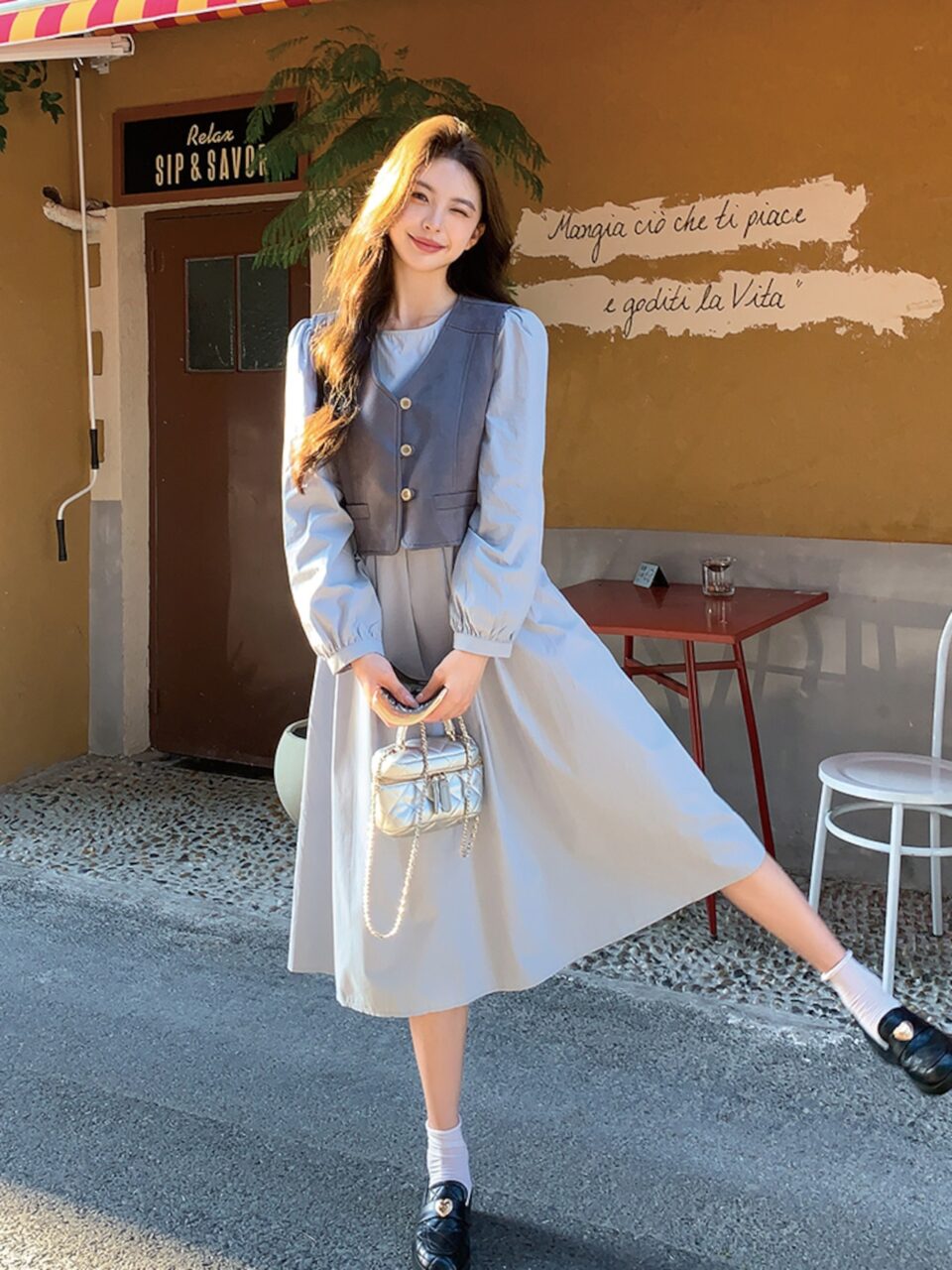 軽やかさがありながらも、1枚重ねるだけでシンプルながらもこなれ感のあるスタイルが簡単に完成します♪ベストがセットになった可愛いセットアイテムをご紹介しますので、チェックしてみてくださいね。