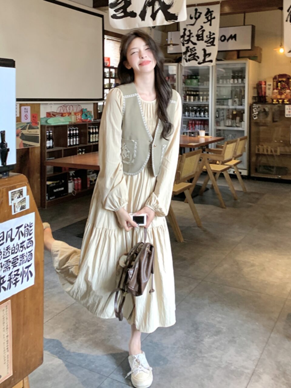 ナチュラルで個性的なコーデを楽しみたい方には、優しいオフホワイトのワンピにレトロなベストを合わせたセットがおすすめ!