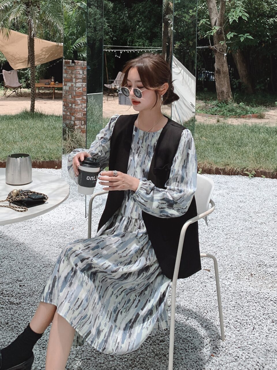 アートなワンピース1枚で着てもいいけれど、ブラックのベストが入ることでリッチクールなコーデが完成♪