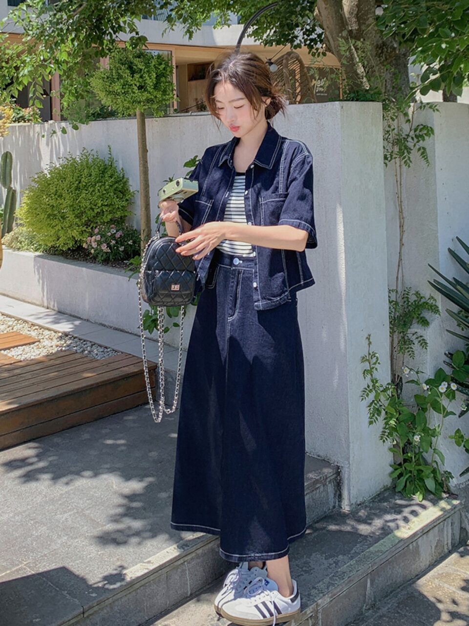 デニムらしいハリ感のある生地はロングスカートにすると、よりエレガントに。ジャケット風のシャツと合わせると、カジュアルでもかしこまったイメージになります。