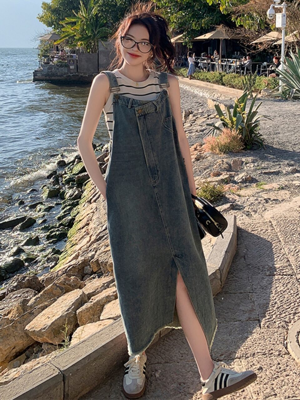 特徴的ながらも不思議となじみやすい、ブルーデニムのサスペンダースカートを取り入れてみましょう。