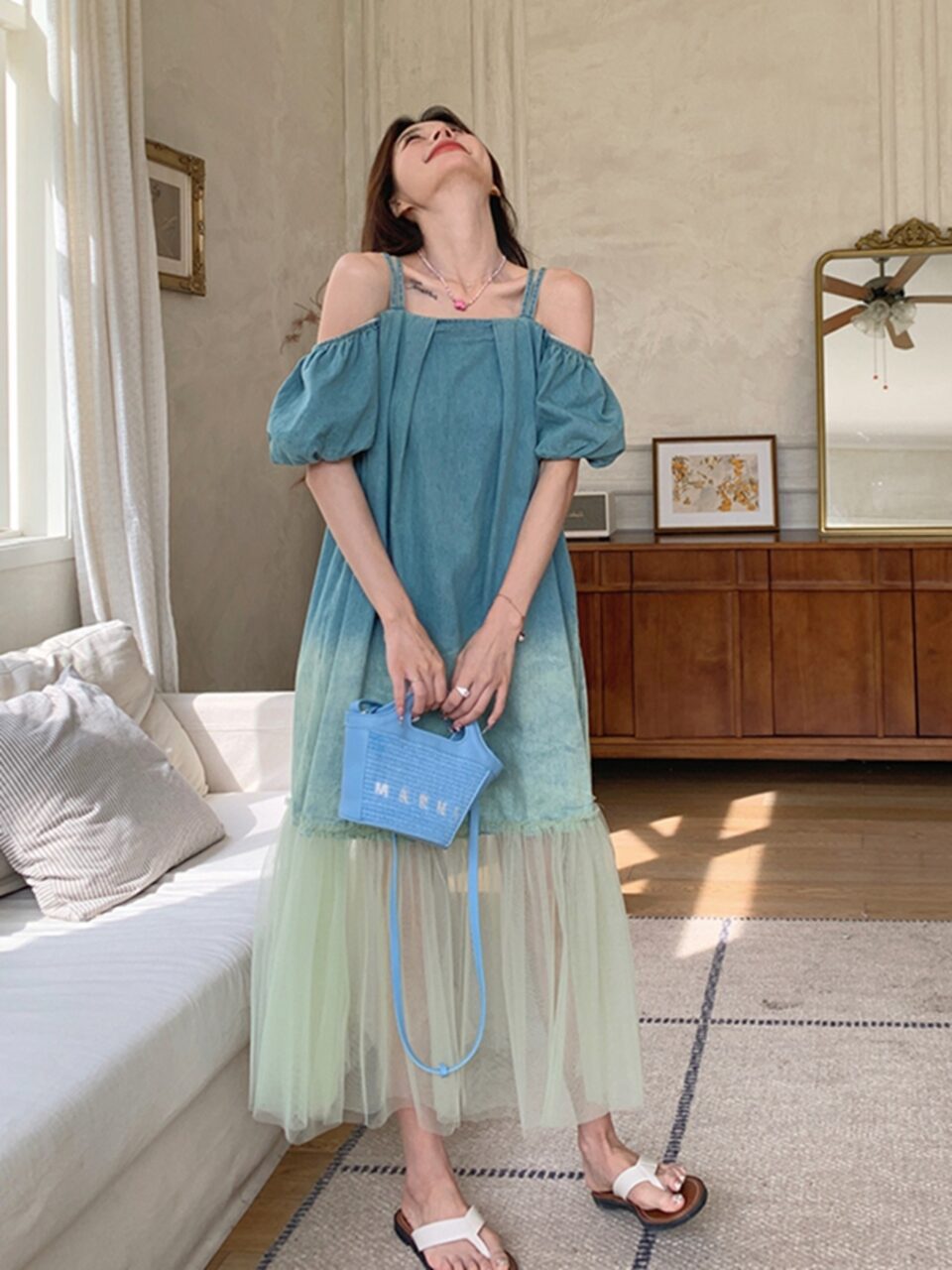 スッキリと肩を見せて、涼しげなスタイルに。グラデーションのようにカラーリングされたデニムとユラユラ揺れるチュールが、まだまだ夏の楽しさを思いっきり演出してくれるでしょう。