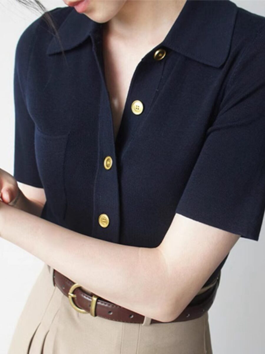 こっくりとしたブラックとゴールドの大きめボタンがアクセントになった、リッチなテイストのポロシャツです。