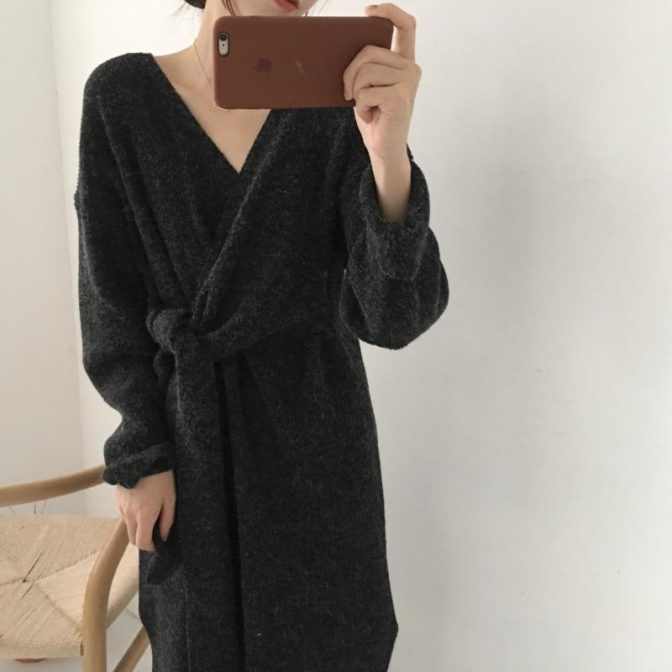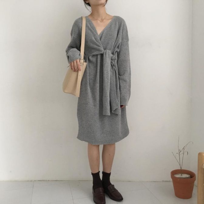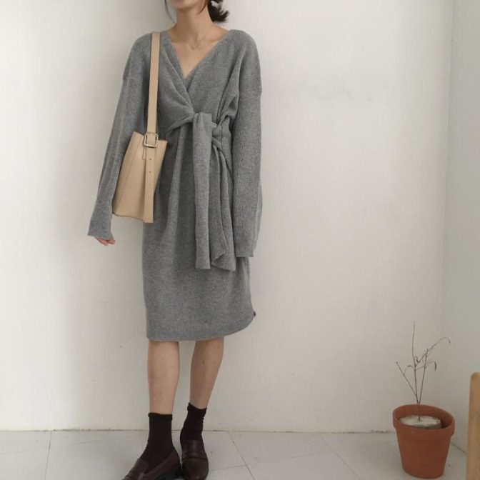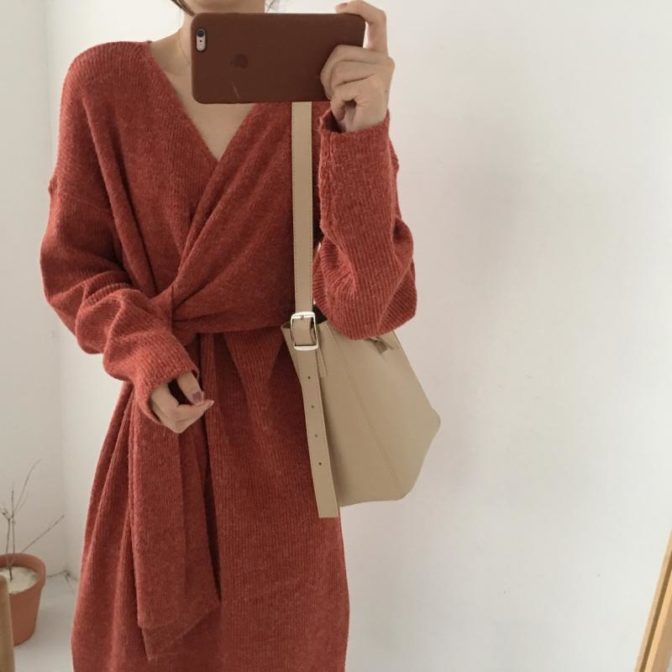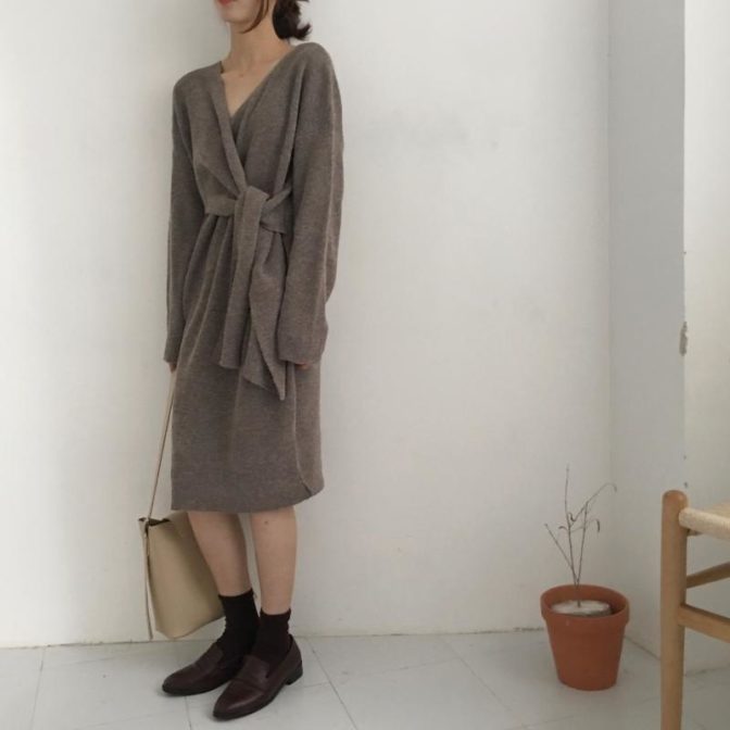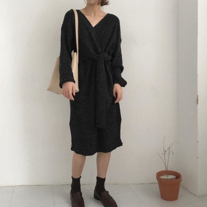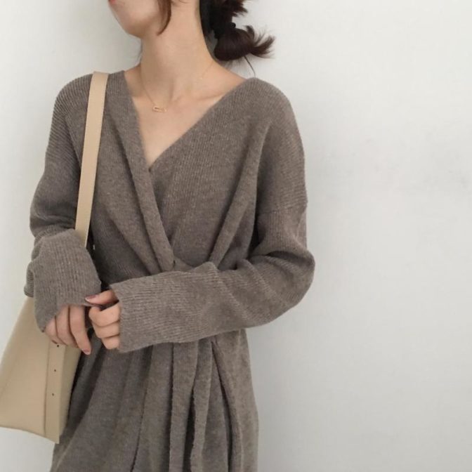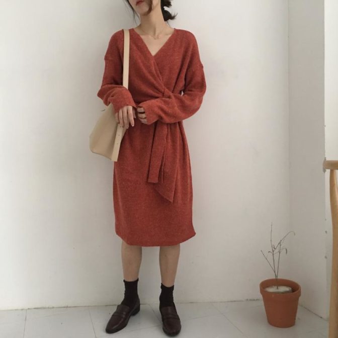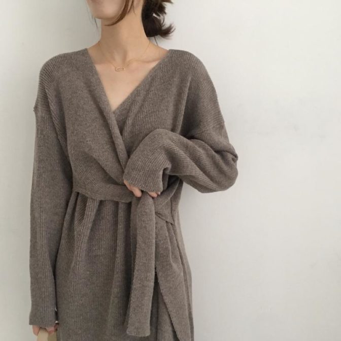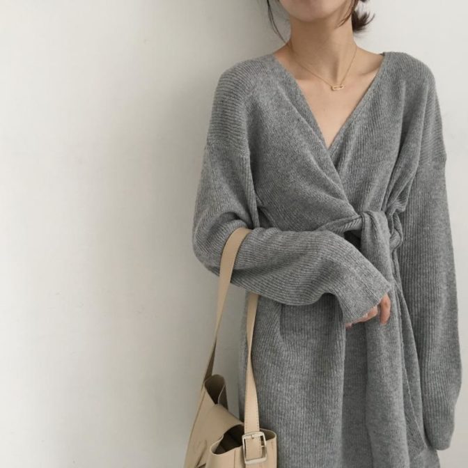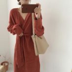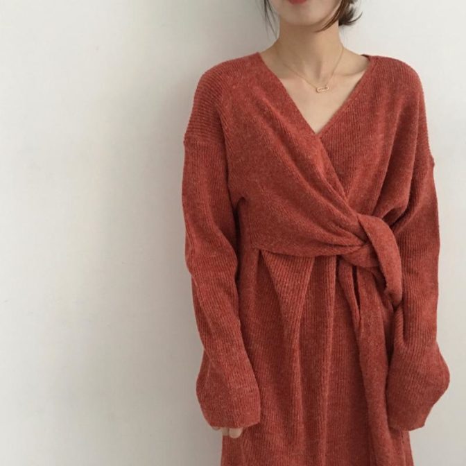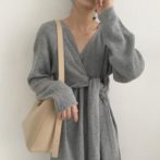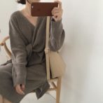 カシュクールネック ひざ丈 ニットワンピース 4色