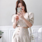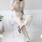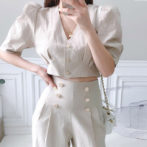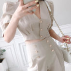 セットアップ クロップド パフスリーブ フレアパンツ お腹見せ