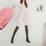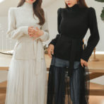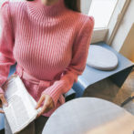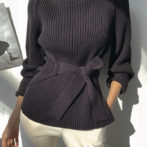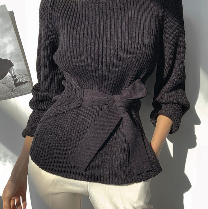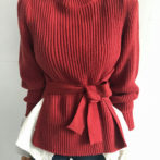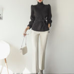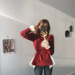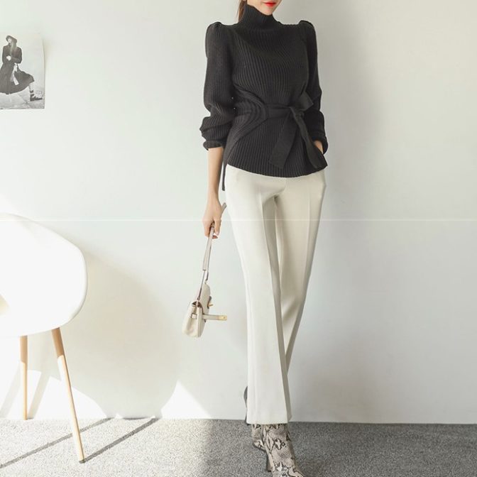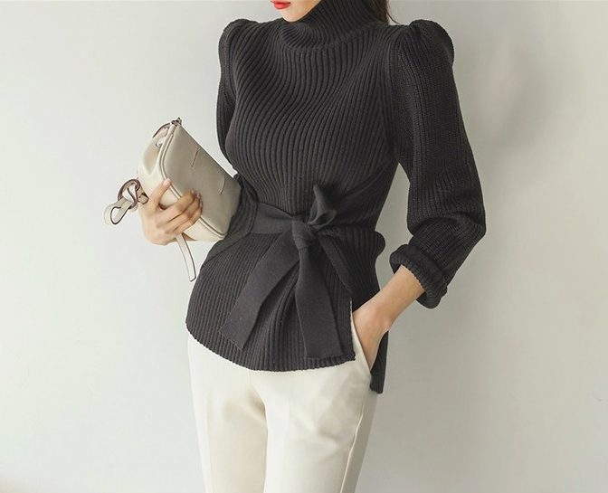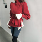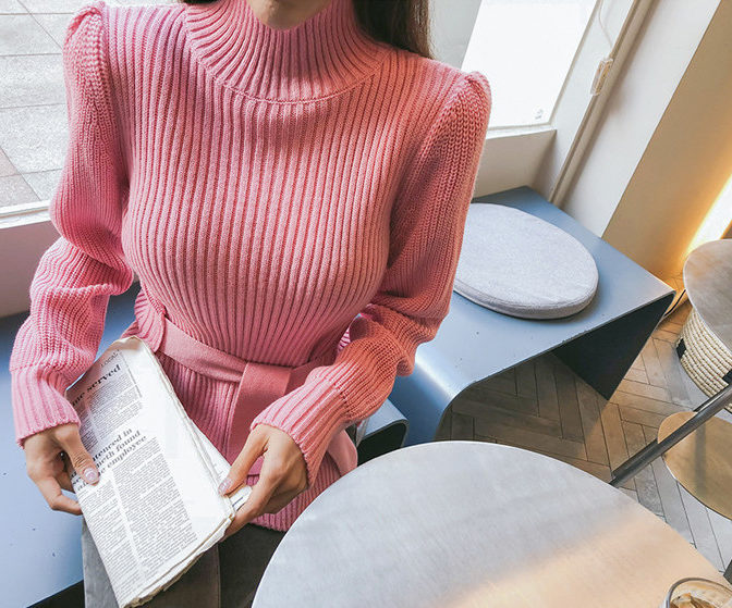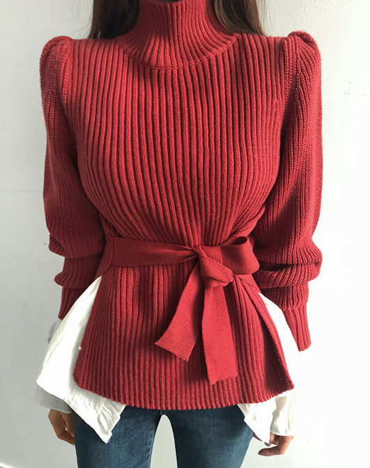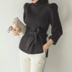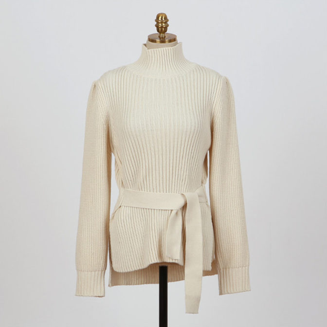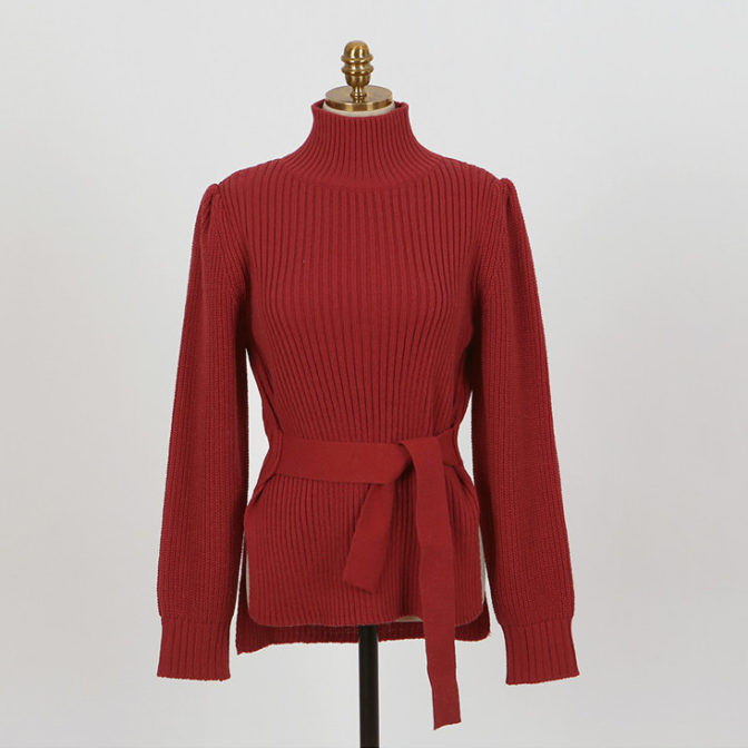 セーター ハイネック パフショルダー ステップドヘム ベルト 4色