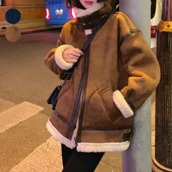 高品質なフェイクムートン素材を使用しており、軽量でありながらしっかりとしたあたたかさを実現しています。裏ボア仕様が肌触りを良くし、寒い季節でも快適に過ごせます。襟ベルトデザインがアクセントとなり、トレンド感あふれるシルエットを演出します。デイリーユースから特別なシーンまで幅広く活躍すること間違いなしです。