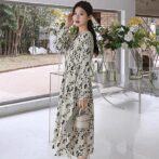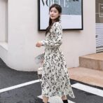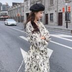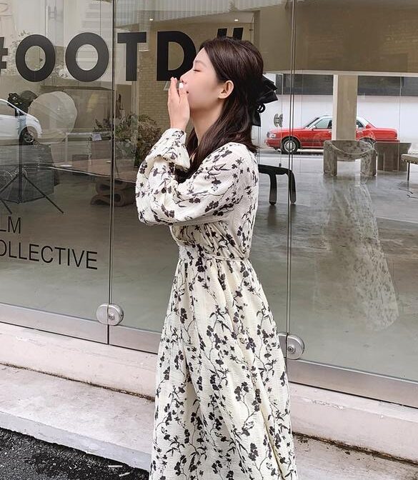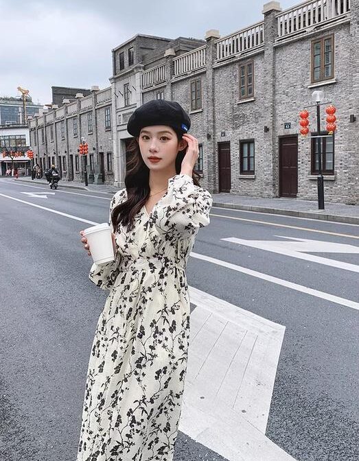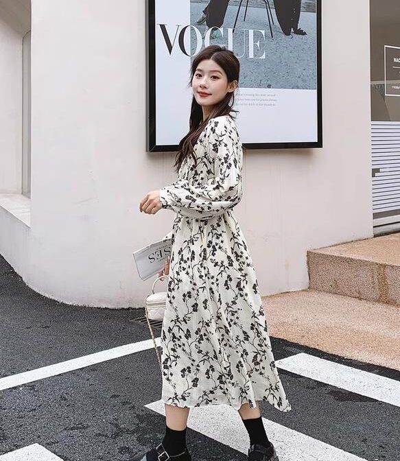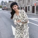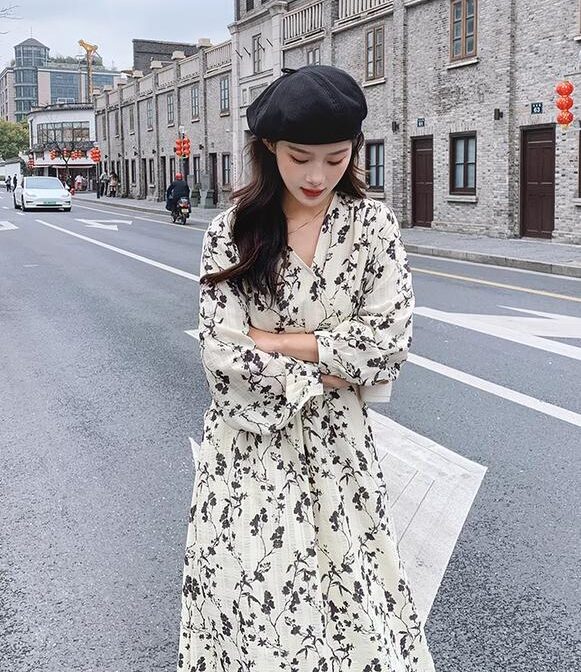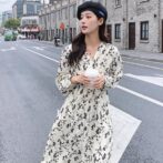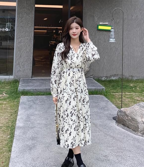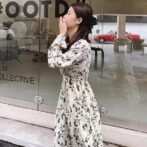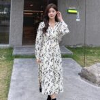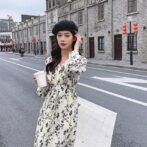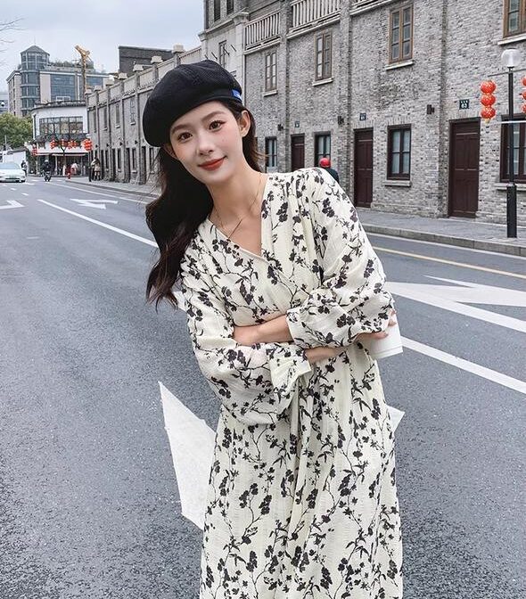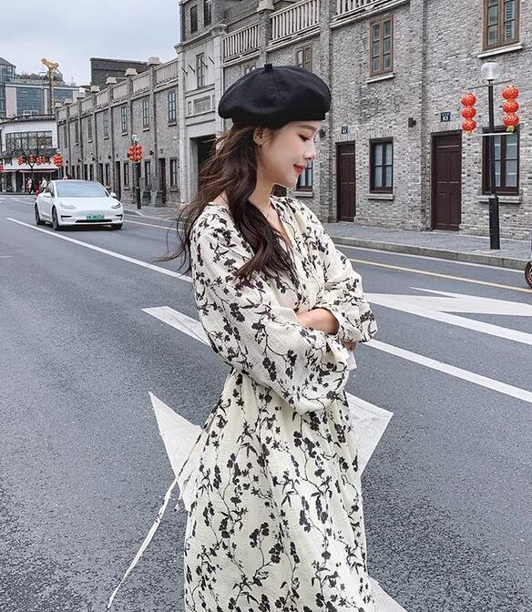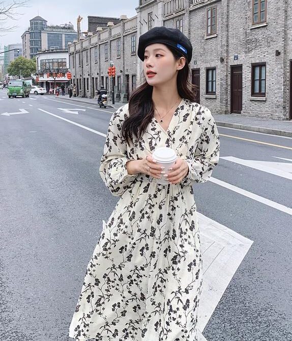 フランス風レトロV ネック花柄ドレス