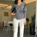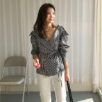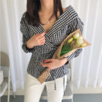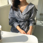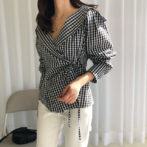 ブラウス ギンガム ラップ ワイドVネック 長袖 カジュアル