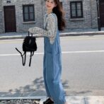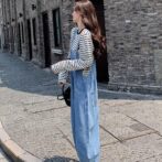 ブルーデニムオーバーオール ハイウエストスリムストレートジャンプスーツ