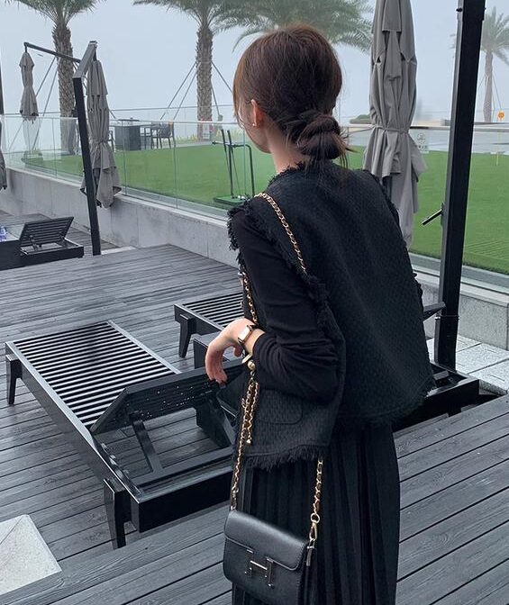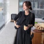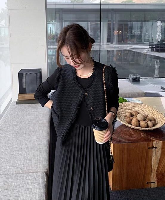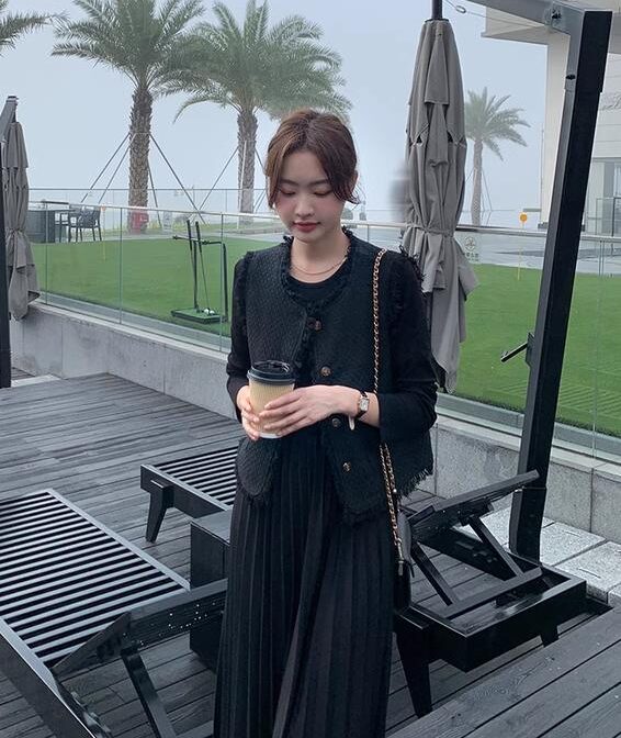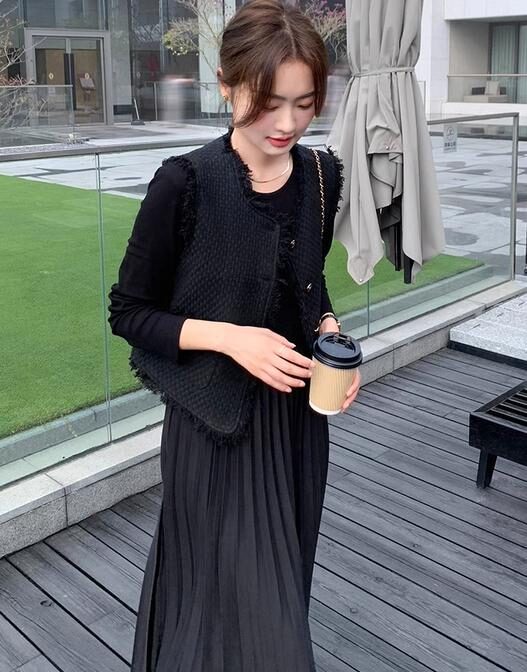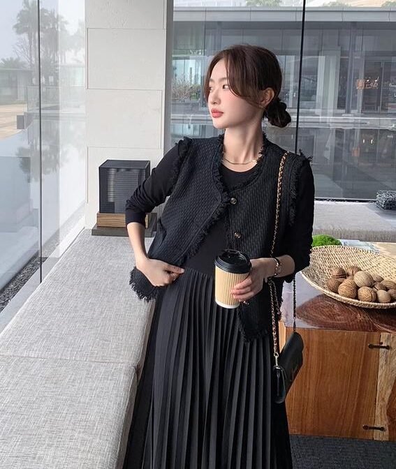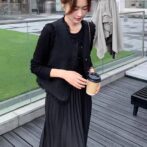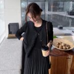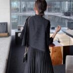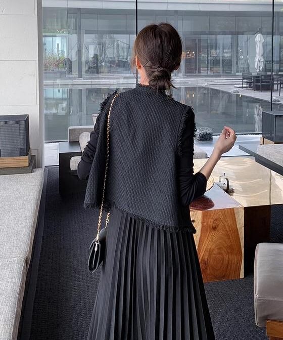 何とも上品な気質漂う「黒のベストドレス 2 点セット」。ユニークなプリーツデザインが華やかなアクセントを添え、どんなシーンにもマッチする優れものです。春と秋に活躍するシーズナルなデザインで、常におしゃれ心を満たしてくれることでしょう。