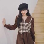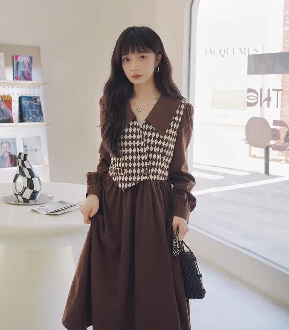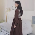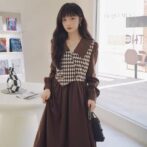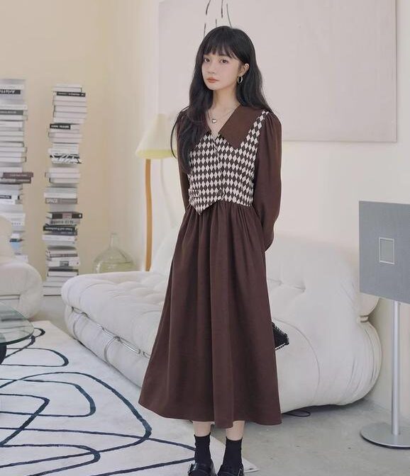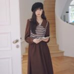 レトロチェック柄スプライシングフェイクツーピースドレス