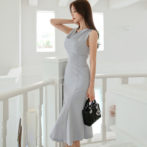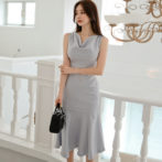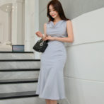 ドレープされた首元がドラマチックなワンピース・ドレスです。