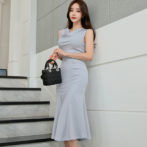 ワンピース ドレープネック タイト 切替 フレア ペールブルー