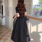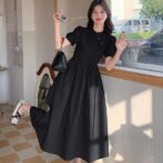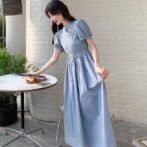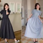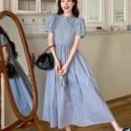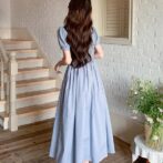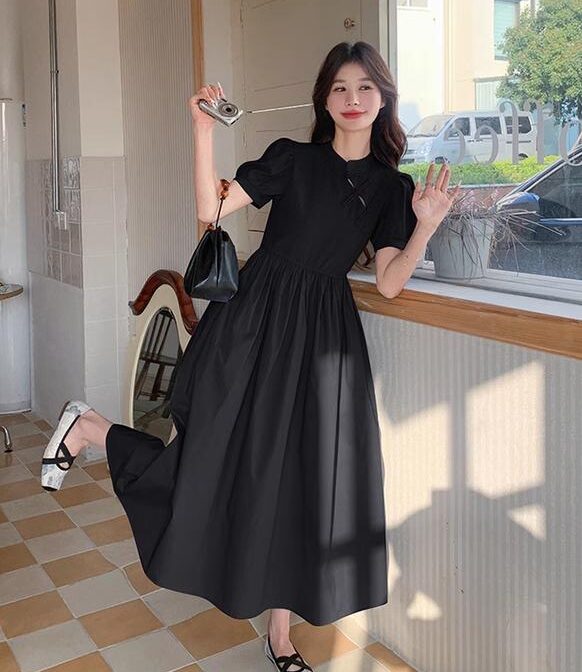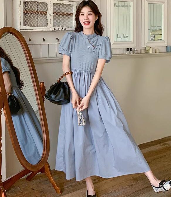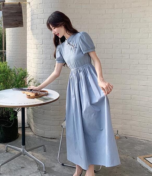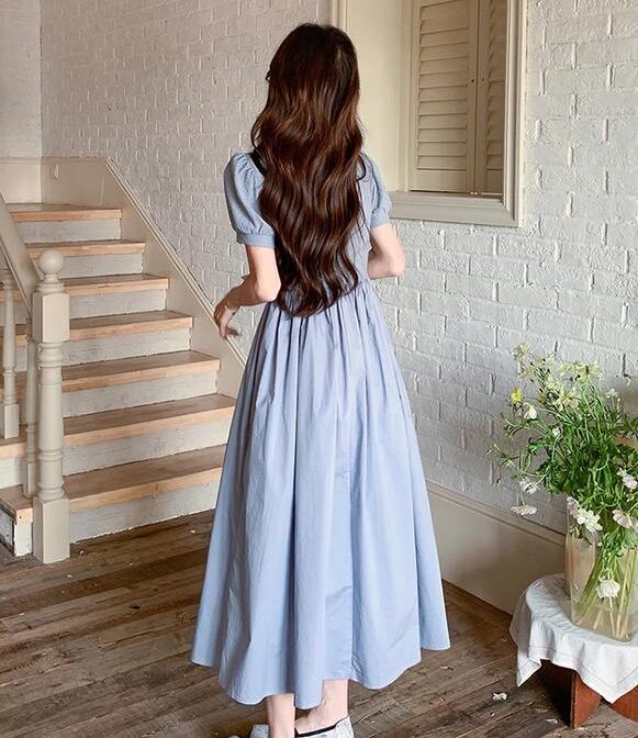 上品な雰囲気漂うプレートボタンドレス。ミッドレングスのウエスト部分は絶妙な位置にあり、着るだけでスタイルがよく見える効果があります。フランス風のスカートは揺れるたびに優雅な気分にさせてくれることでしょう。