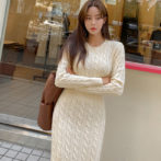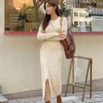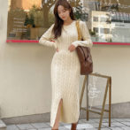 ワンピース ケーブルニット タイト 背中開き ミディ 前スリット