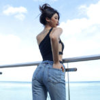 シンプルなデザインにゴールドボタンが映える大人の肌見せ水着。