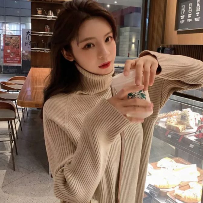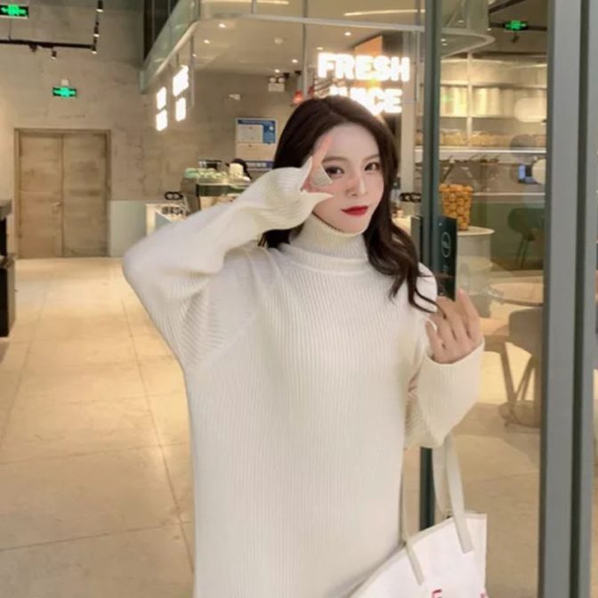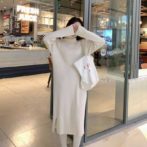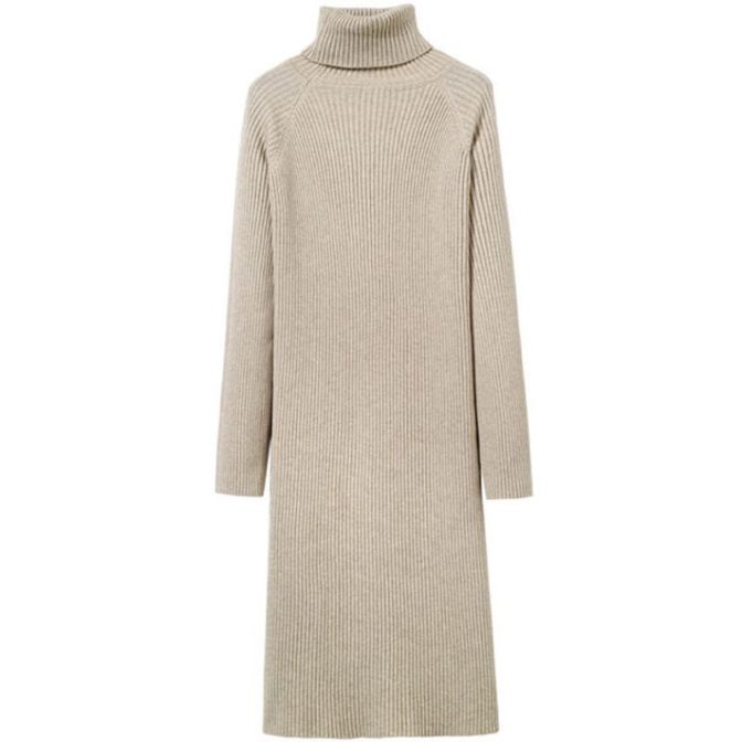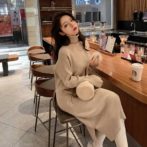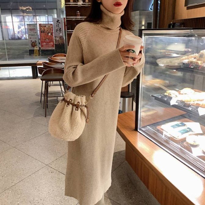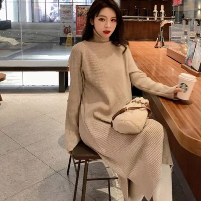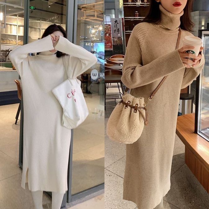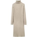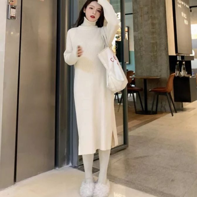 ワンピース ミモレ丈 リブニット タートル ハイネック スリット