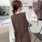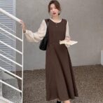 長袖ツーピースドレスレディースウエスト ミドル丈スカート
